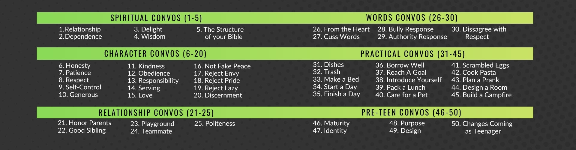 When my oldest was still in pull-ups, I created a spreadsheet outlining everything I wanted to teach him before he left home. It didn’t take me long to realize that parenting is far more organic than a checklist. Life doesn’t happen on a spreadsheet! Still, having a plan gave me direction. As my kids entered middle and high school, I found myself returning to that ‘master list’ to guide our conversations. These one-pagers are the fruit of that effort: one dad discovering that discipleship happens in the daily, but it’s still wise to have a plan.